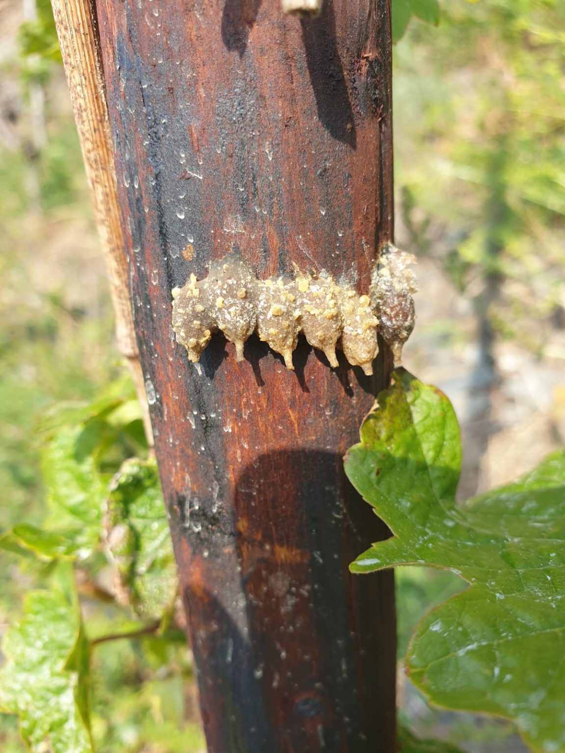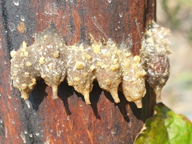 Aus Baumharz erschafft sie tropfenförmige Brutzellen. Hier an einem Pfahl im Steillagenweinberg der Moselregion. Oberhalb der Lage befindet sich ein Kiefernwäldchen. Der perfekte Lebensraum für diese kleine Wildbienenart.