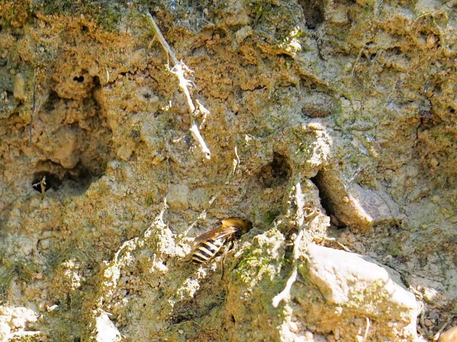 Eine kleine Gemeinschaft der Gehörnten Mauerbiene (Osmia cornuta) besiedelt eine Abbruchkante.