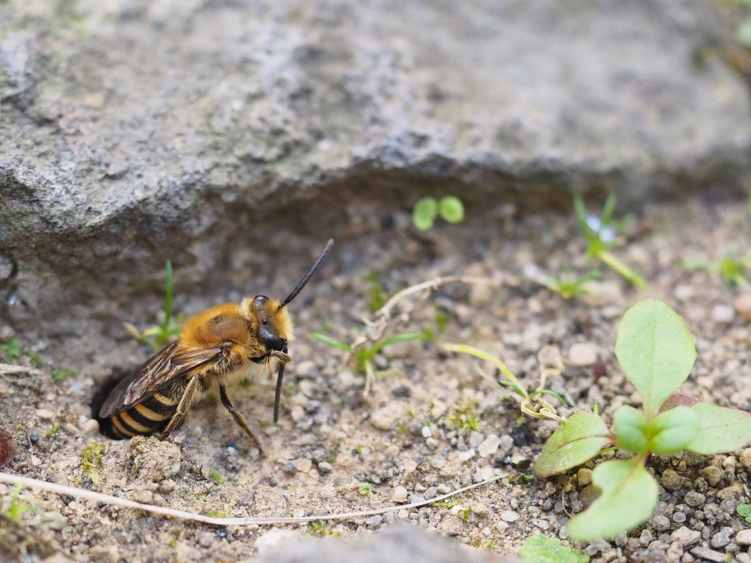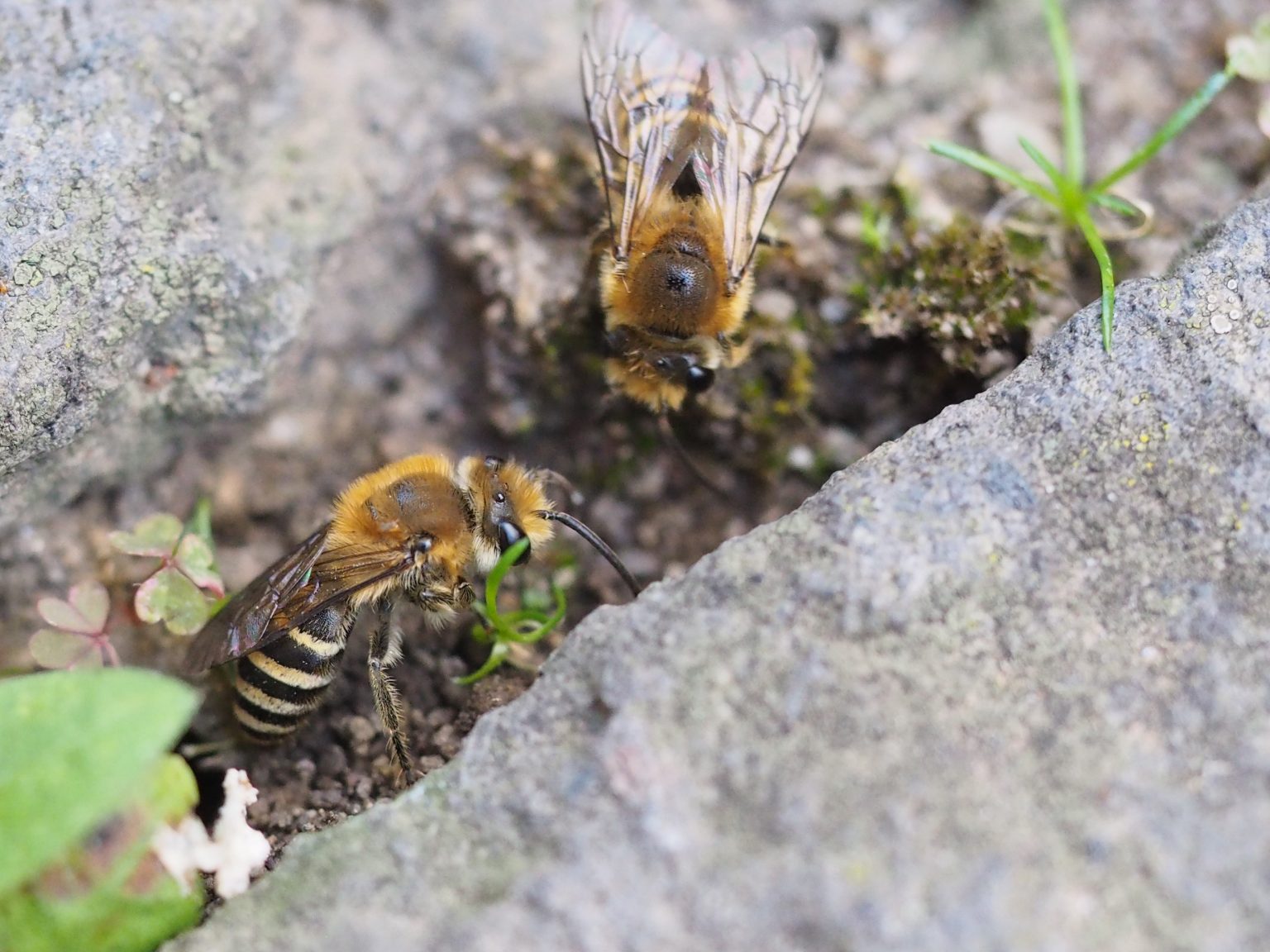Die Weiden-Sandbiene (Andrena vaga) auf der Suche nach einem geeigneten Platz für den Nestbau