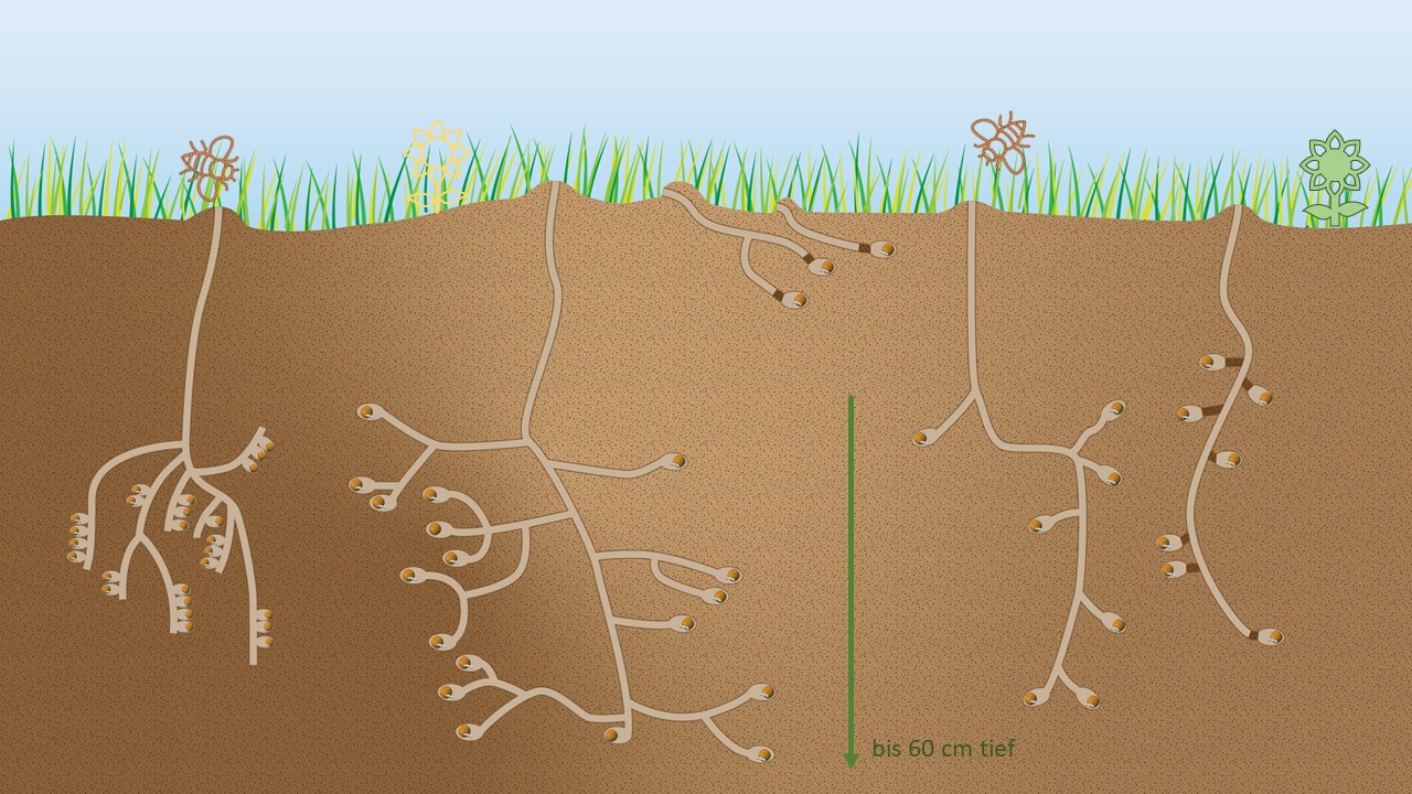 Für den Betrachter, der die Wildbienen an den Ausgängen der Niströhren beobachtet, bleibt die imposante Architektur der Niströhren in der Erde verborgen.  Die Wildbienen graben sogenannte Niströhren teils tief in die Erde.