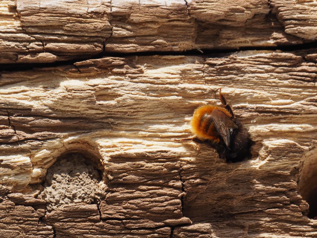Fraßgänge von Käferlarven in Totholz wird unter anderem von der Frühen Scherenbiene gerne angenommen.
