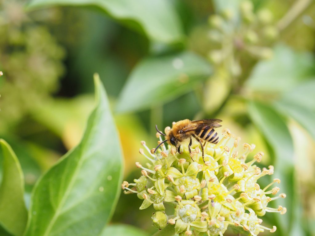 Ganz in der Nähe der Kolonie wächst ein üppiger Efeu und bietet genug Nahrung. Ein guter Lebensraum für die Wildbienenart, die spät im Jahr erscheint.