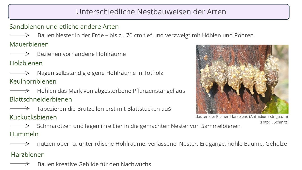 Jede Wildbienenart hat zudem ihre ganz spezielle und besondere Art und Weise, wie und wo sie ihr Nest für den Nachwuchs anlegt. Der Vielfalt sind keine Grenzen gesetzt.