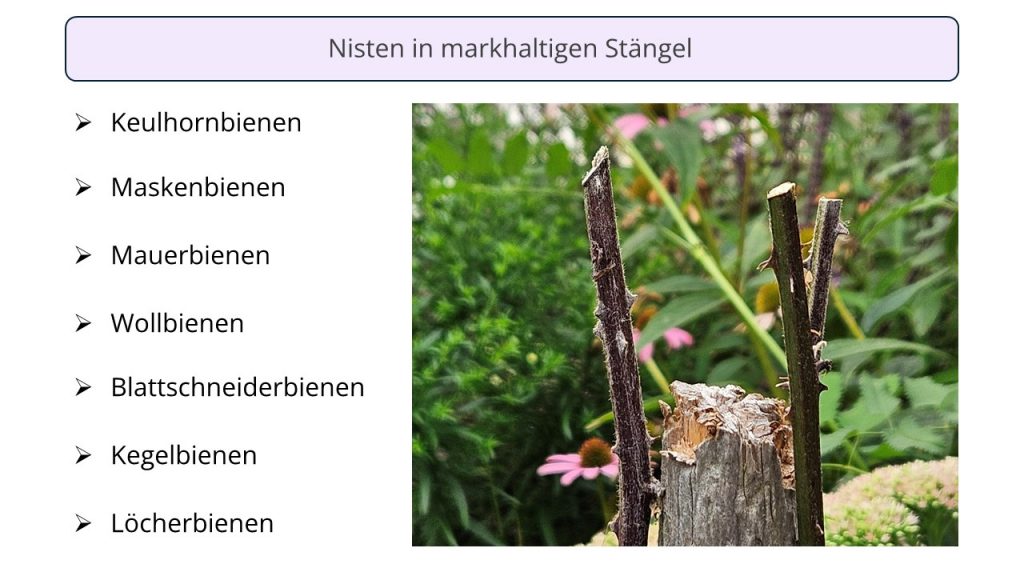 Einige Wildbienenarten nisten in markhaltigen Stängel von Pflanzen wie zum Beispiel Holunder, Brombeere, Himbeere oder Königskerze. Im Gegensatz zu den horizontalen Pflanzenröhren der oben vorgestellten Nisthilfen, sind diese nicht hohl. Die Wildbiene öffnet sich die Röhre selbst, indem sie das weiche Mark entfernt und anschließend Brutzellen anlegt.